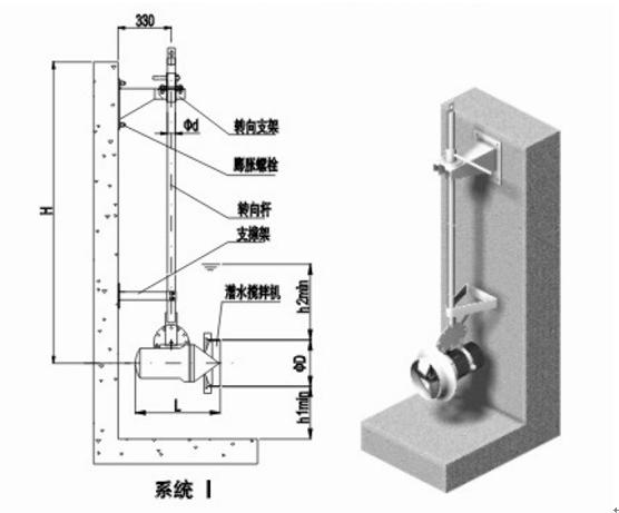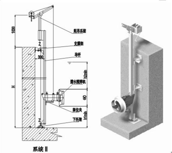 注:1、潛水?dāng)嚢铏C的專用安裝系統(tǒng),可在無需排除池中污水的情況下,能快速安裝和拆卸攪拌機;